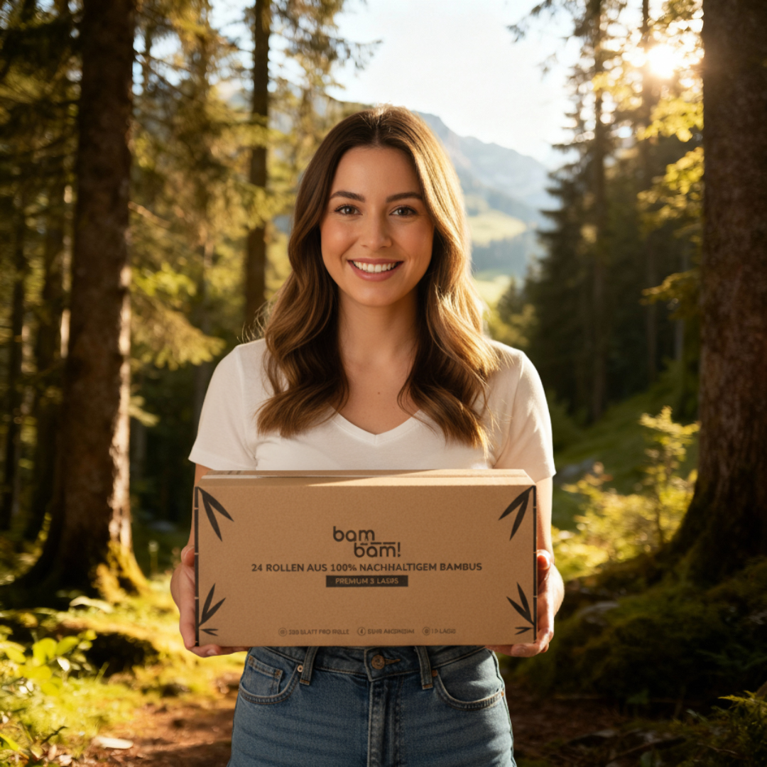 BamBam! besteht zu 100 % aus nachhaltigem Bambus – einer schnell wachsenden, ressourcenschonenden Pflanze, die mit minimalem Wasserverbrauch, ohne den Einsatz von Pestiziden und mit wenig Arbeitsaufwand gedeiht. Unsere Produktion setzt auf erneuerbare Energie und unser Toilettenpapier wird in einer vollständig plastikfreien und recycelbaren Verpackung geliefert.