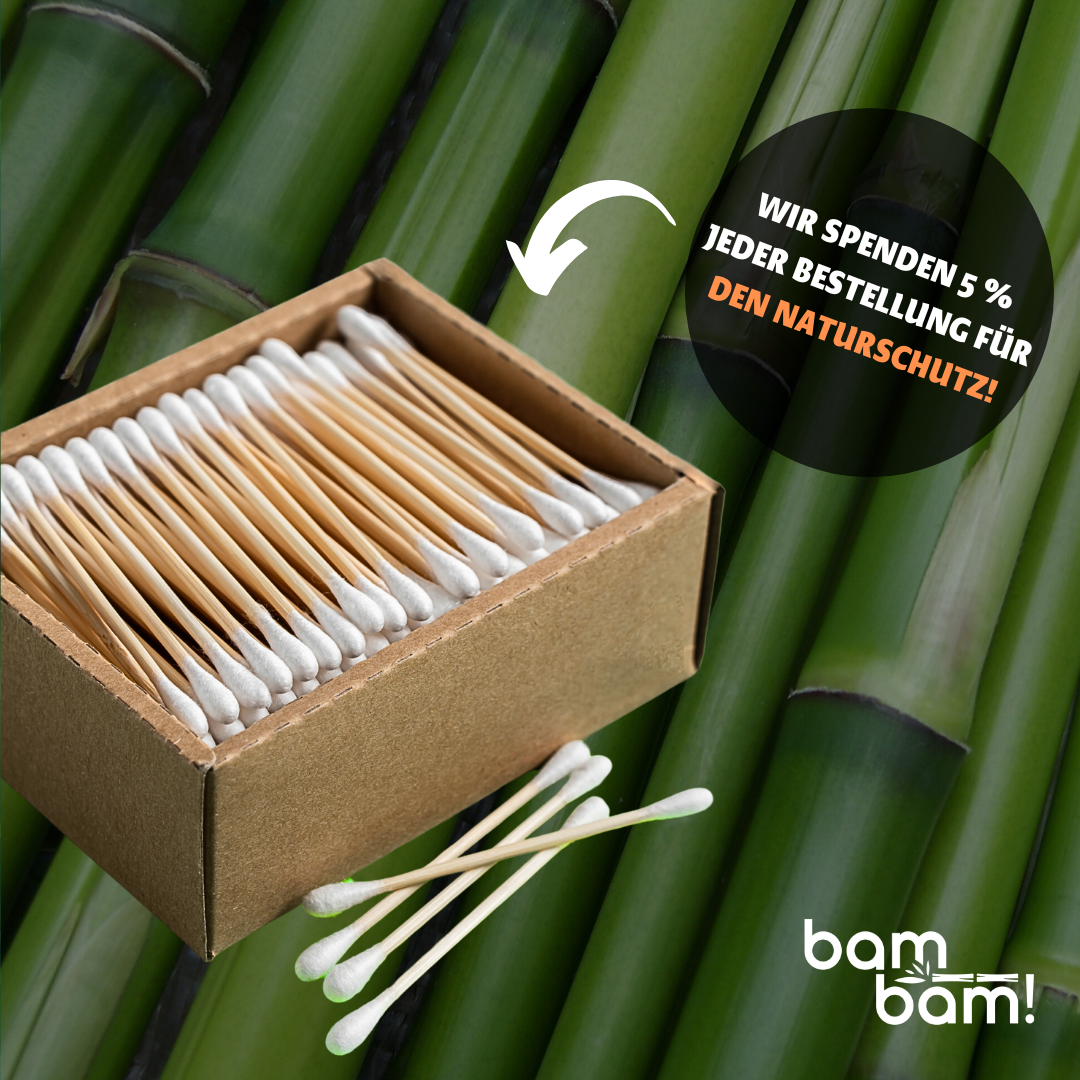 Papier-Wattestäbchen sind bereits eine viel bessere Wahl als solche aus Plastik. Doch auch hier gibt es Anbieter, die ihre Produkte nicht plastikfrei verpacken. Ausserdem finden wir: Für ein Produkt, das nur etwa eine Minute genutzt wird, lohnt es sich nicht, einen Baum zu fällen, der 60 Jahre zum Wachsen braucht. Deshalb setzen wir auf Bambus – ein extrem schnell wachsendes Gras.